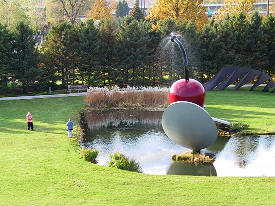 Walker Sculpture Garden visitors getting their photos in front of the big cherry.