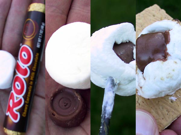 Later on, smores were the order of the evening. I decided to try to be creative by embedding a Rolo in a marshmallow. This attempt revealed a number of logistical issues: An average Rolo is too big to be successfully wrapped in an average-size jumbo marshmallow. Also, when finally embedded, there's the problem of marshmallow/Rolo stability after being pierced by the fire stick. Fundamentally unstable by nature, I was unable to keep the experiment on the fire very long due to concerns that it may fall apart. (Hence the pale color of the finished product.) All the work would've been worth it had the result been tasty, but I'm sad to report the Rolo/smore combination left a lot to be desired.