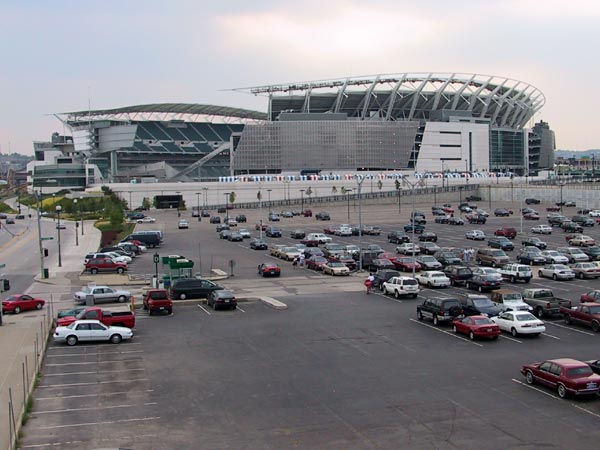 Paul Brown Stadium, home to the Cincinnati Bengals, as seen from the bridge. Cincinnati seems to be in the midst of a fairly aggressive riverfront renewal program. I would hope part of it involves getting rid of that parking lot.