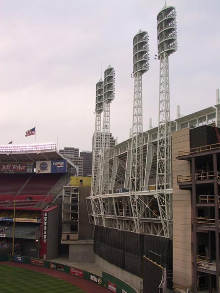 Great American Ballpark rises over Cinergy. Considering the proximity of the two sturcutres, it'll be interesting to see how they handle the old park's implosion. There doesn't seem to be much room for error.
