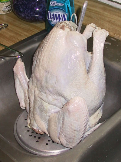 The turkey after being prepped for dunking. It doesn't look very appetizing at this point, does it?