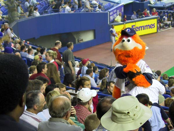 Youppi, the Expos' mascot. With only 7000-some fans in the stadium, he pretty much had time to visit everyone. As for me, well, I ended up getting a head-rub.