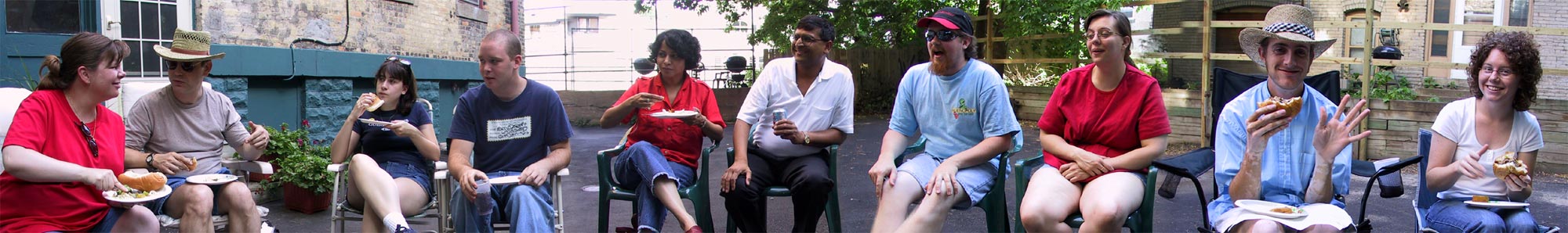 The crowd at this year's BASH-A-ROO, from left: Becky, Ted, Liz, Brandon, Renu, Vipin, Ben, Beth, Rich and Heather. (Whatever Becky was doing to attract attention must have ended by the time I got the camera around to those last two.)